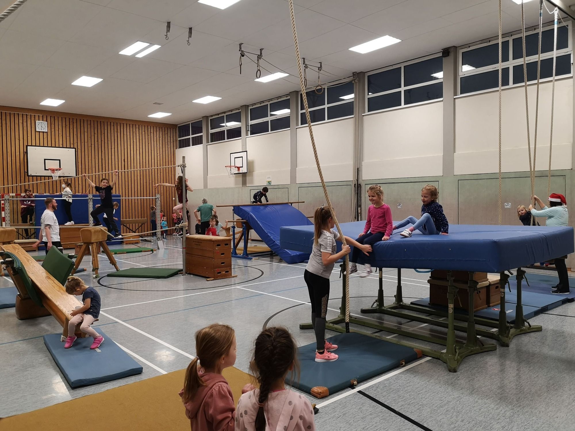 Nachdem sich die Gruppe mit dem Weihnachtsmambo musikalisch und rhythmisch aufgewärmt hat, konnte das muntere und abwechslungsreiche Turnen über einen ganz besonderen Parcours beginnen. Die Kinder balancierten über dicke Seile, eroberten die Sprossenwand, seilten sich von einer Mattenburg ab und rutschten an mehreren Stellen über Bänke und Matten, um zur nächsten Turn-Station zu kommen.